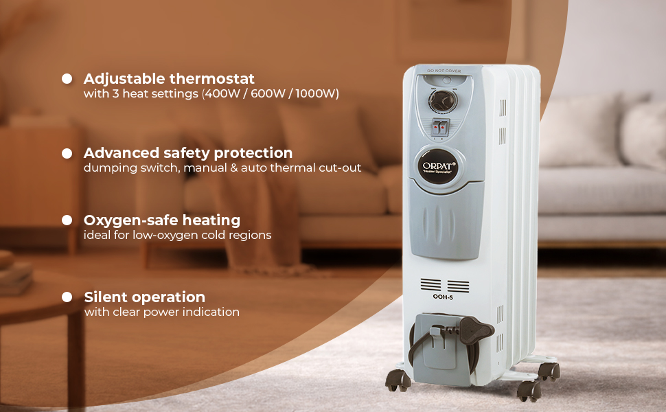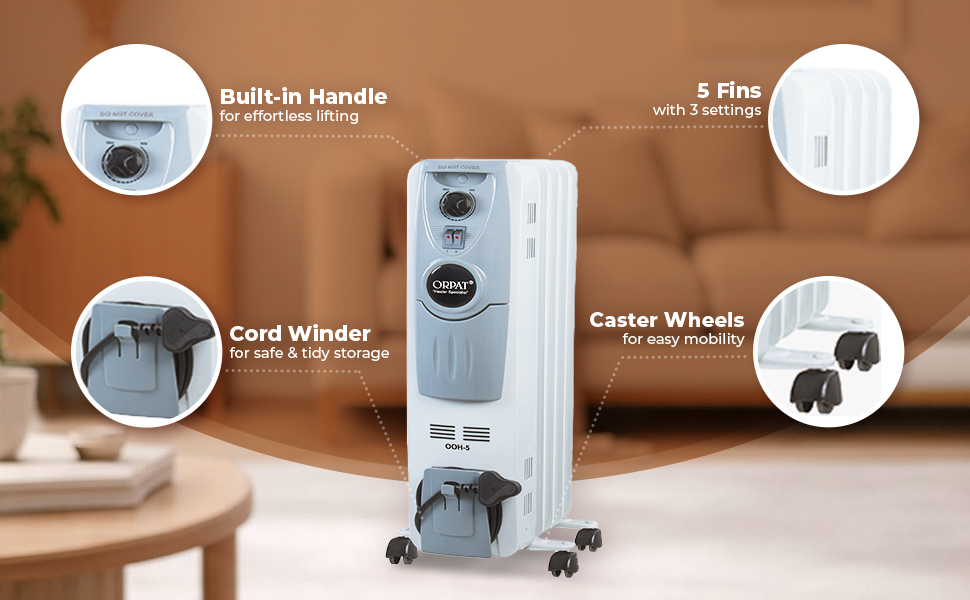 An oil room heater that features a number of distinctive characteristics like an international ergonomic design and stylish make, 5 fins with three heat settings of 400W,600W, and 1000W respectively. An adjustable thermostat to maintain room temperature, and it has three exceptional safety features which are namely: safety dumping switch to safeguard against the improper installation, manual reset thermal cut out, auto reset thermal cut out. It also performs noiselessly, has a power indication system, caster wheels for easy mobility, comes with a cord winder, and a built-in handle. This creates no suffocation as this heater doesn’t burn oxygen and is suitable for chilly areas where the oxygen level is low. A much suitable device for like bed room.