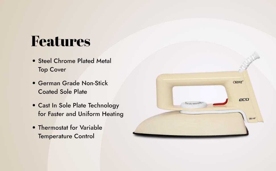 A resourceful effortless iron that features a steel powder-coated metal top cover, lightweight and instant heating capacity, German grade non-stick coated soleplate, cast in soleplate technology for faster and uniform heating, thermostat for variable temperature control, thermal fuse for overheat safety protection, power indicator, shockproof plastic body, silk braided 180-degree swivel power cord for easy movement with stress reliever and twist reliever, cool touch body with comfortable handle and grip, super clean surface finish with pleasant aesthetics, a button groove that reaches into tricky areas and a cord winder facility. An instrumental product in design.