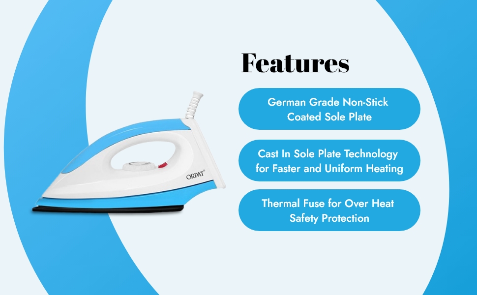 A proficient effortless iron that features a number of features such as, lightweight and instant heating capacity, German grade non-stick coated soleplate, cast in soleplate technology for faster and uniform heating, thermostat for variable temperature control, thermal fuse for overheat safety protection, power indicator, shockproof plastic body, silk braided 180-degree swivel power cord for easy movement with stress reliever and twist reliever, cool touch body with comfortable handle and grip, super clean surface finish with pleasant aesthetics, a button groove that reaches into tricky areas and a cord winder facility.