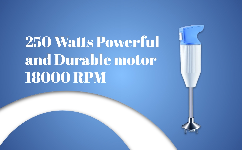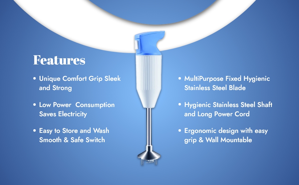 A hand blender that features a number of amazing utilities like sleek and strong make, a powerful 250W motor, 18000RPM, a design which is easy to store and wash, a smooth and safe switch, elegant design and make, a wall mounting utility, a special hygienic stainless steel Multi-purpose blade, a hygienic stainless steel shaft, long power cord, and a comfortable and firm ergonomic grip. A very handy and convenient to use blender, due to its shape and structure.