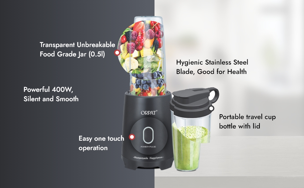 An extraordinary product that have many distinctive Features such as Powerful 400W motor for quick and easy use, Compact design With Elegant look, Transparent Unbreakable Food Grade Jar (0.5l), Hygienic Stainless Steel Blade that is Good for Health, 0.5L diswasher safe Portable travel cup bottle, Easy one touch operation, Portable cup: fits in most Car and bike Cup holders, skid-resistant feet, Silent and Smooth Operation, Travel cup Lid to store prepared smoothie, shakes in bottle. an Excellent product for everyday use.