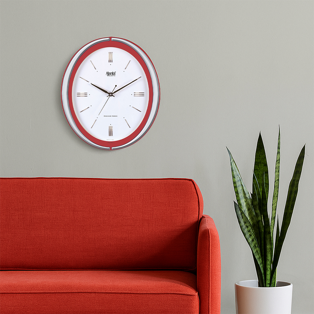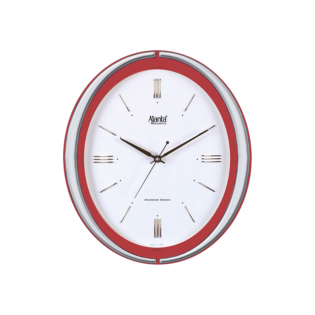 An elliptical designer clock that manifests itself with a broad contour and a matte interface. The numberings have a sharp and classic theme and style. On the top and bottom of the contour lies a carving that looks subtle and attractive from an overall point of view of the clock. The clock is a great compliment to places like private cabins and lobbies where there is a considerable match between the color themes of various objects and the clock.