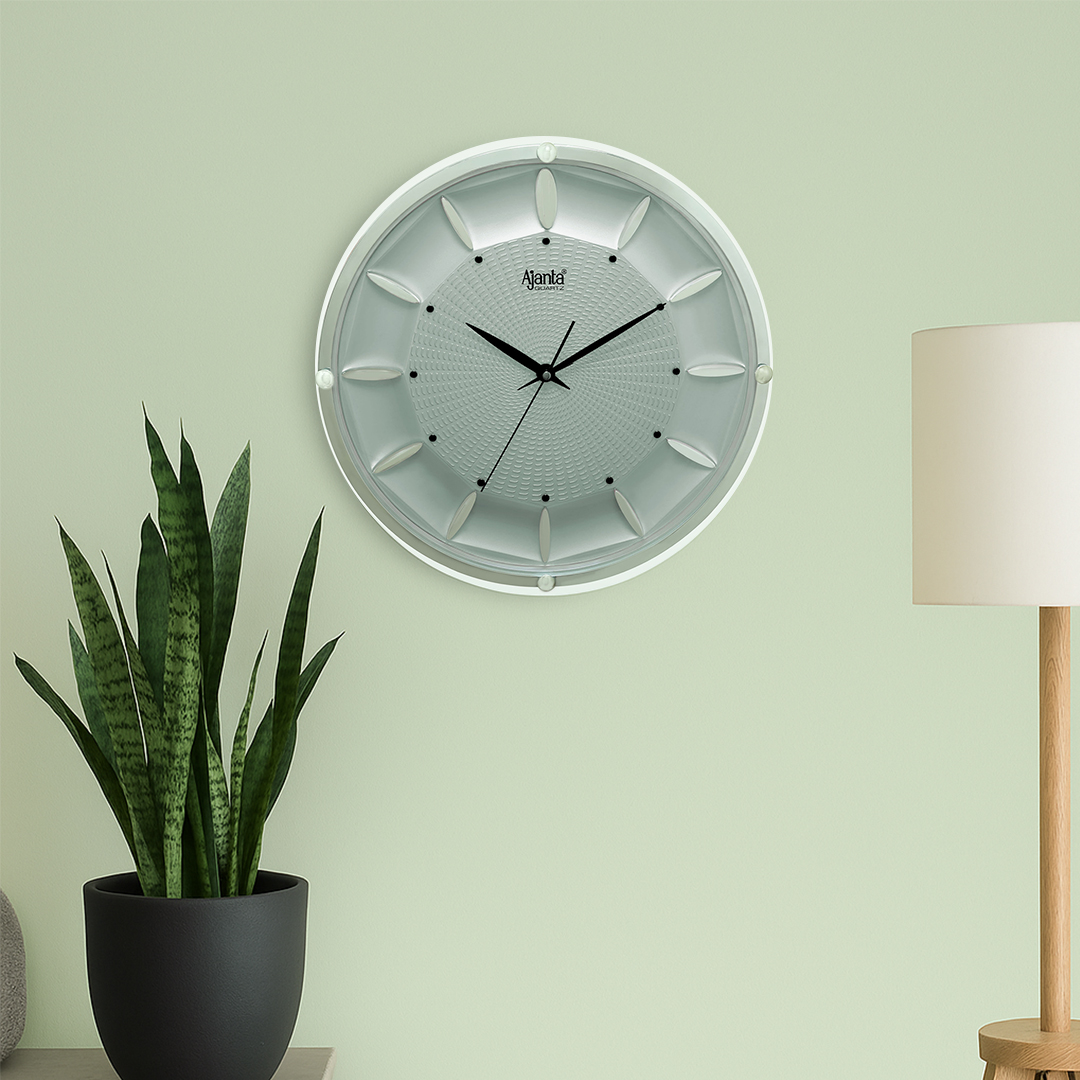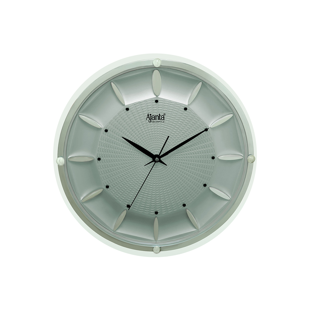 A glossy designer sweep clock that has a lavish looking white interface topped by a sharp looking barred time indications in shimmery
