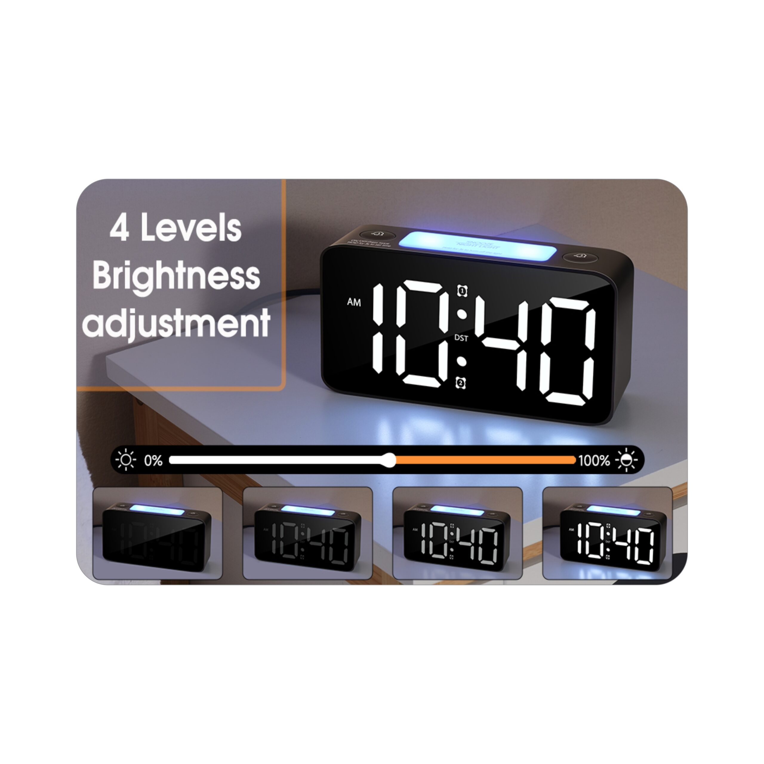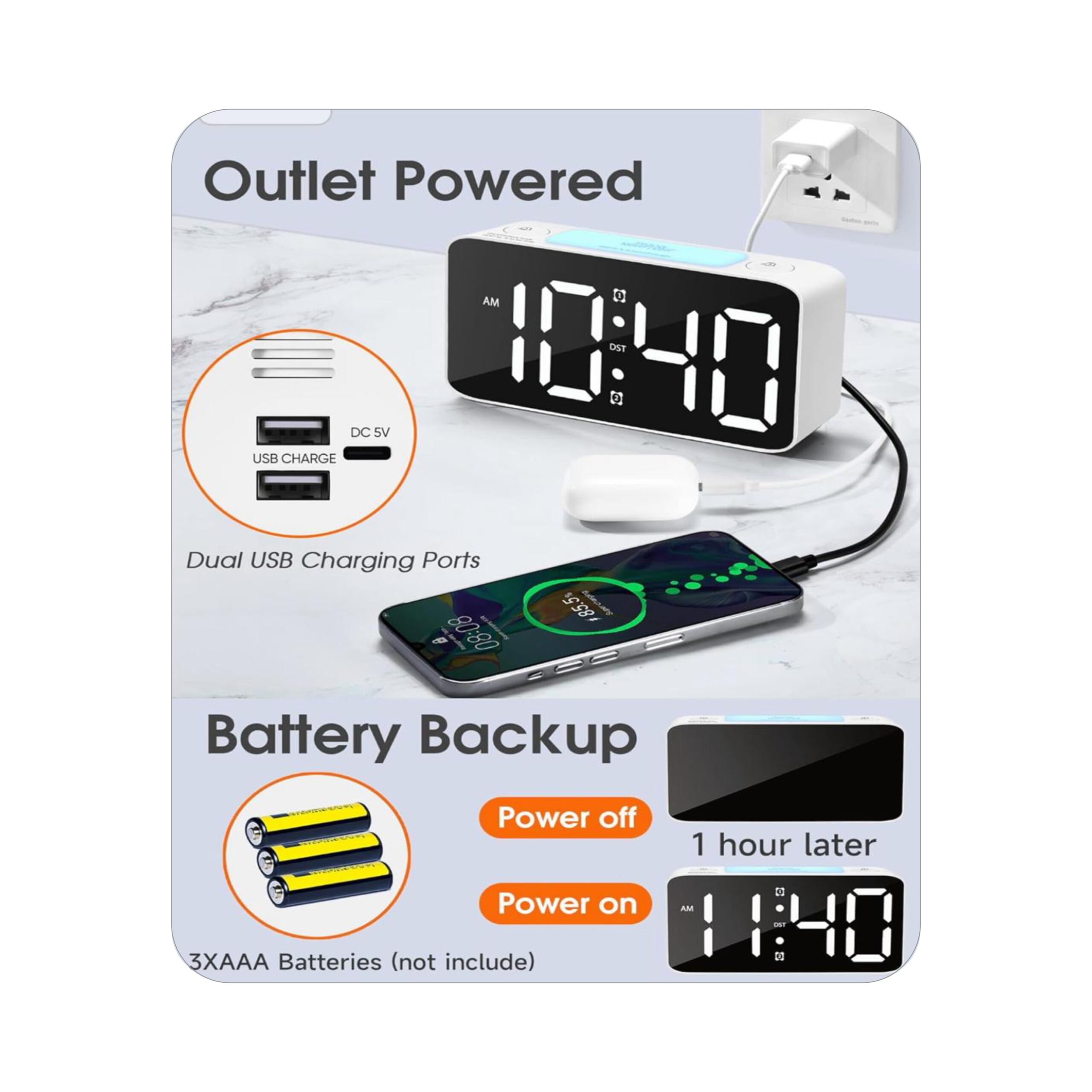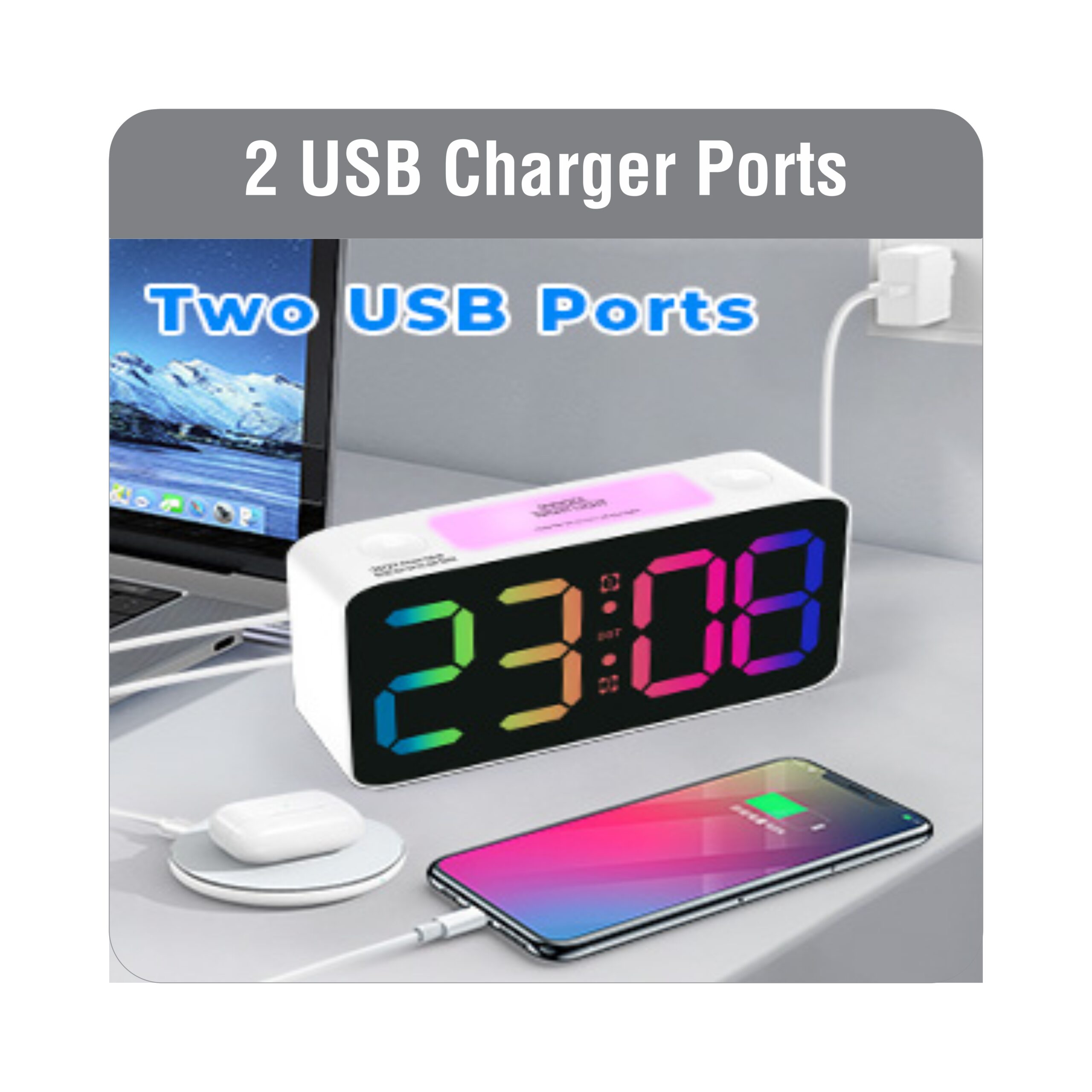 Adjustable Volume,DST, Dimmer,USB A charger PORT,small clocks for Bedrooms,ok to wake up for kids,Teens (white+RGB)
