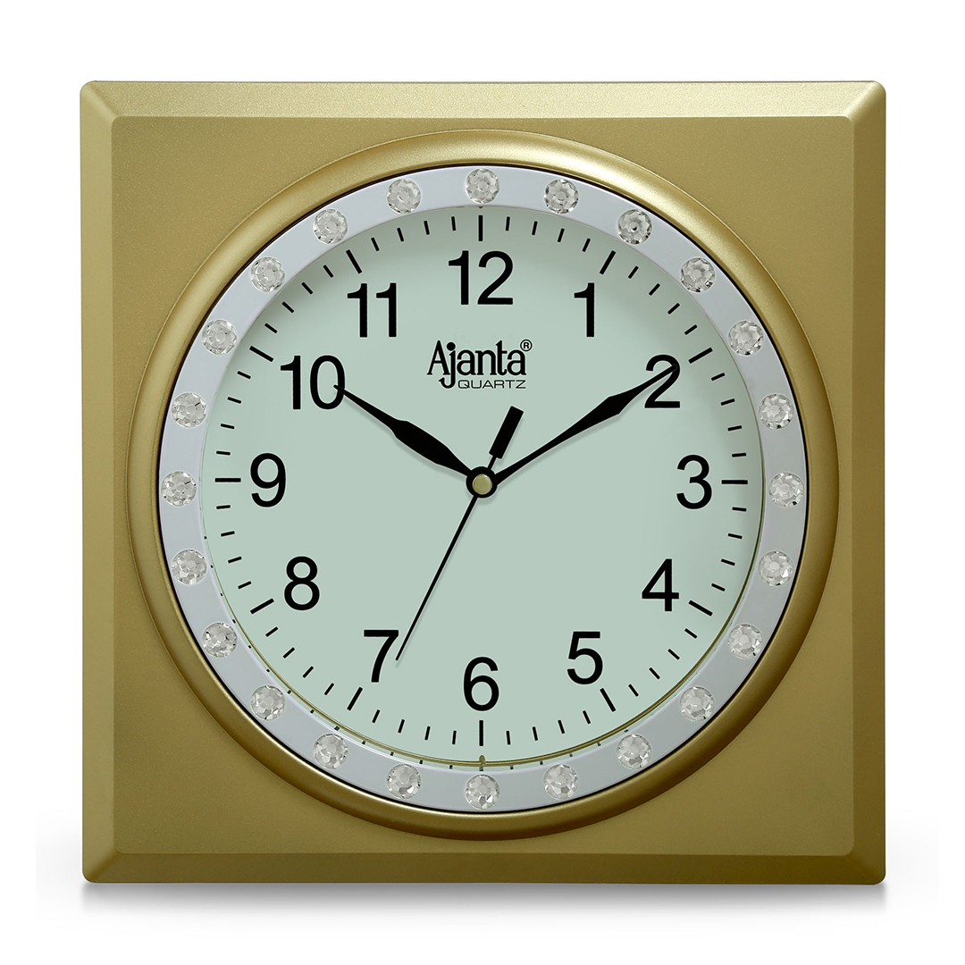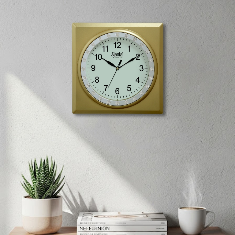 A unique simple clock that shines with its shimmery body and inner circular interface. Its interface holds quarterly numerals in a bold