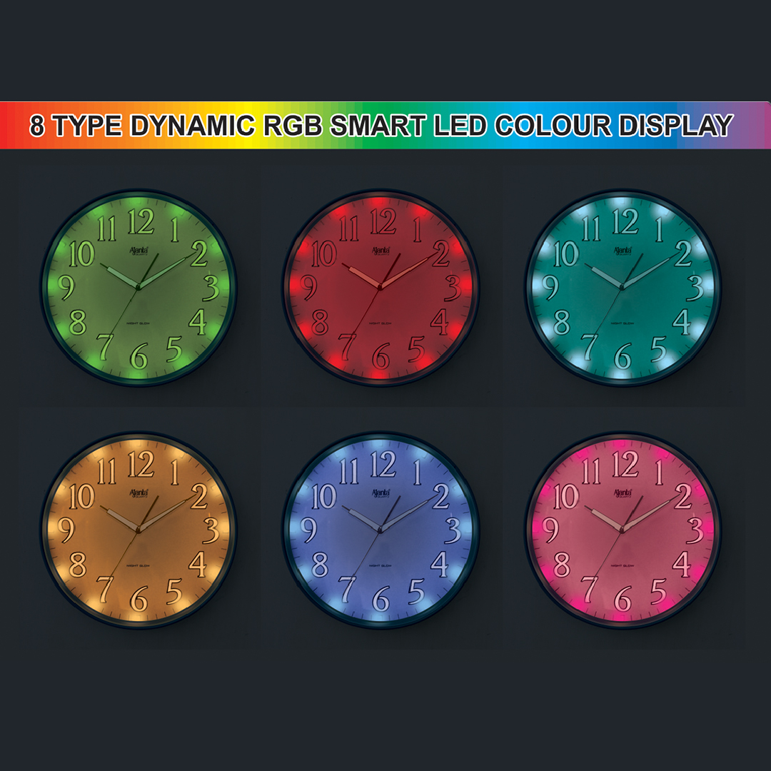 8 colour light with night glow smart led clock.Non ticking super silent modern clock, you no longer have to worry about its annoying clicking noises at night.auto change led colour light every 7 secound & multi colour of led light.